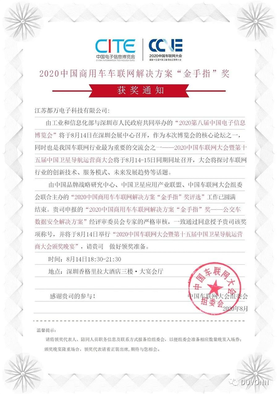 为进一步展示我国商用车车联网发展阶段性成果,推介经验,树立典型,彰显榜样的力量,激励和引导广大企业家营造良好的发展环境,中国车联网大会组委会联合中国卫星应用产业联盟、中国品牌战略研究中心公平、公正、公开的原则,根据企业自愿申报的原则,最终评审出中国车联网产业7大金奖。我司申报的公交车数据安全解决方案荣获2020中国商用车车联网解决方案“金手指”奖。